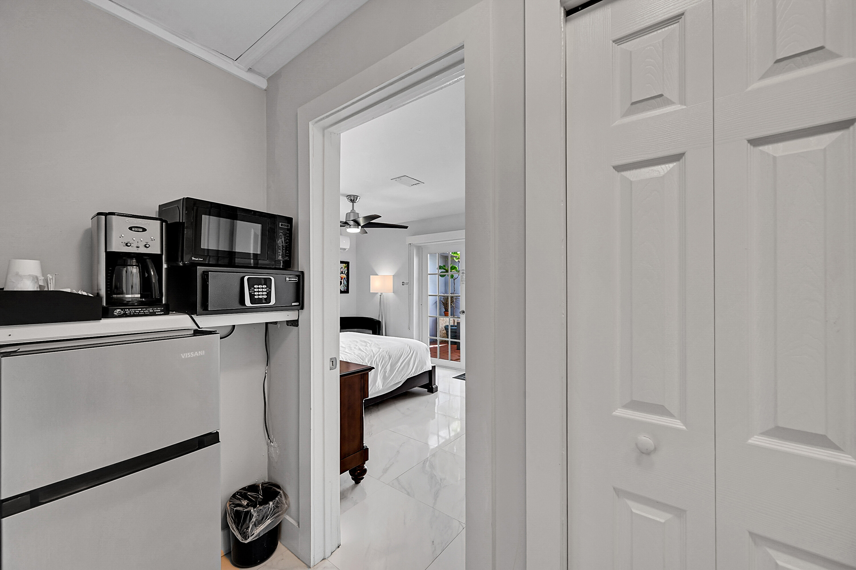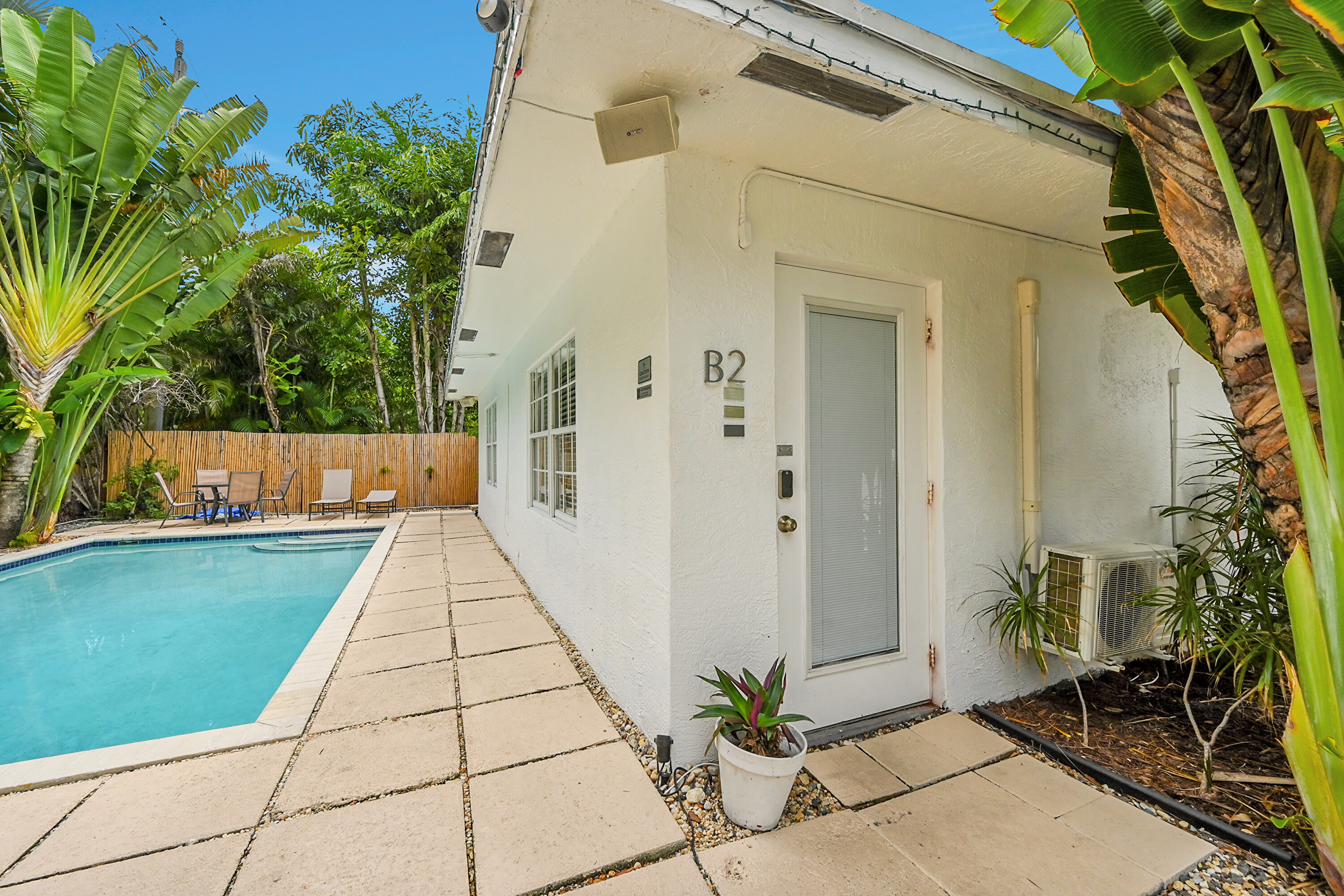 The (A2) Poolside - Queen is overlooking the pool offers a serene first-floor escape with a queen bed and elegant French glass door entrance with modern décor with deep blue accents, ample natural light, a flat-screen TV, mini-fridge, and coffee maker, the room balances comfort & style. Enjoy morning coffee with tranquil views, take a refreshing swim just steps from your door, or relax in the tropical ambiance of this stylish suite.