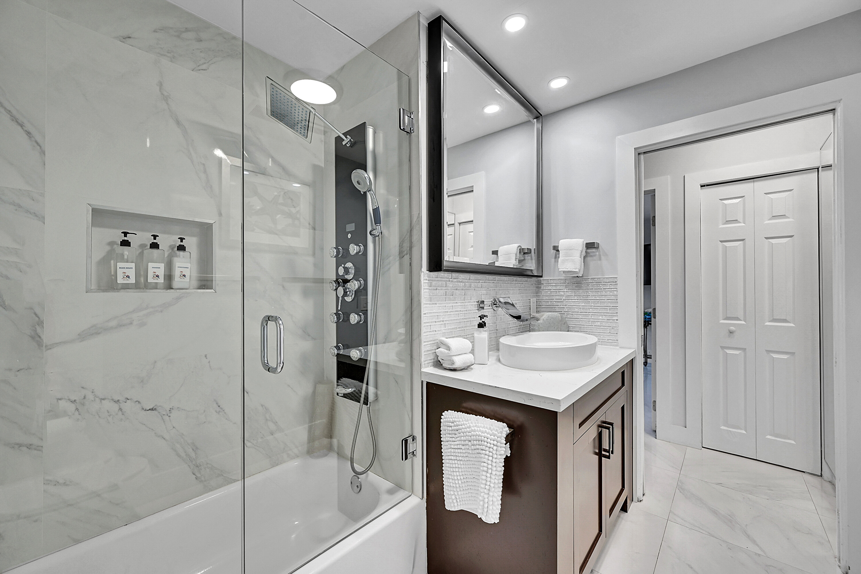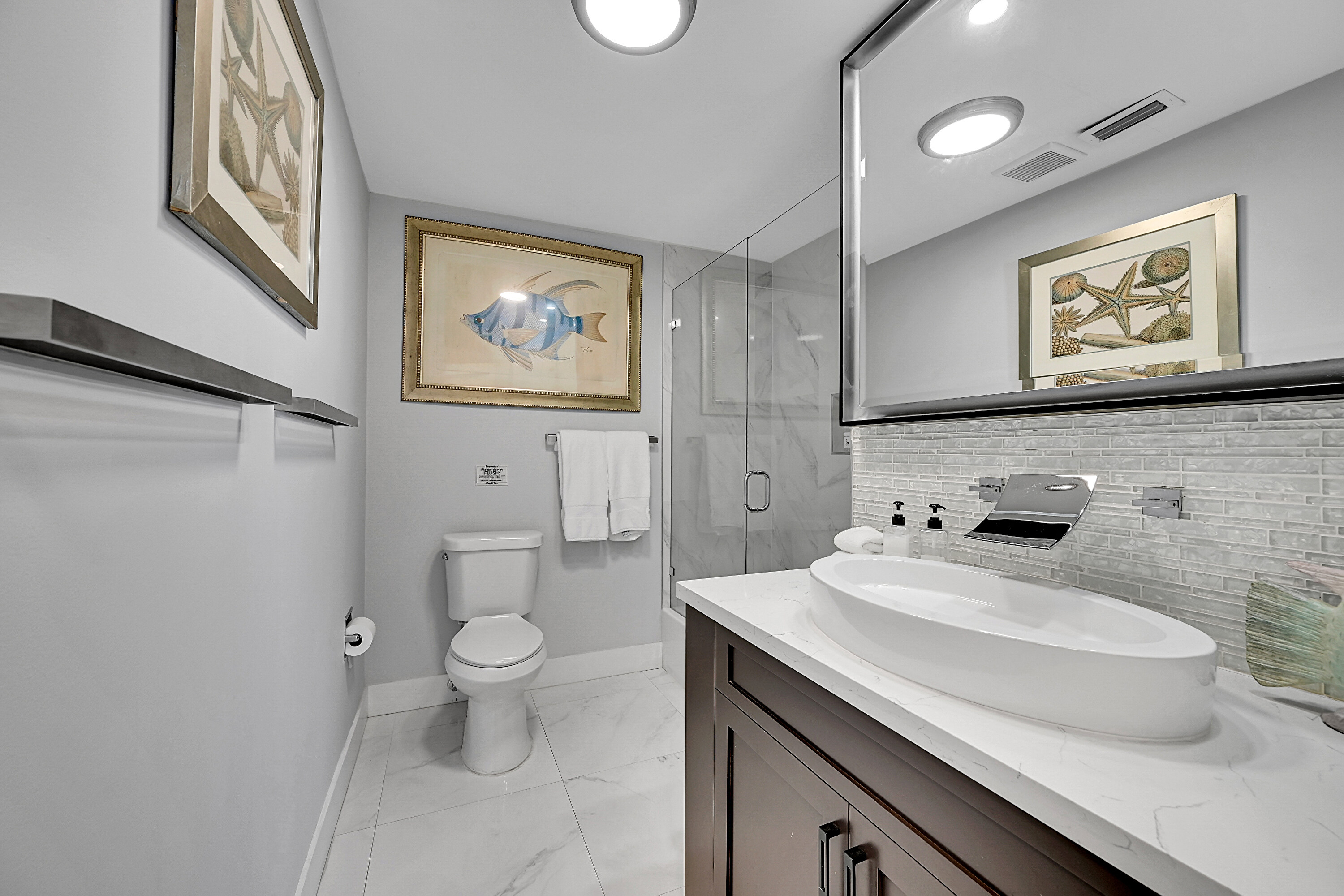 Perfectly positioned for both style and convenience, The (B00) Essential - Queen blends modern comfort with easy access to all resort amenities. The room features a queen bed with crisp linens, vibrant artwork, a flat-screen TV, mini-fridge, microwave, coffee maker, and a cozy armchair. The private bathroom offers a vessel sink, marble-tiled backsplash, and a shower/tub combination with natural light.