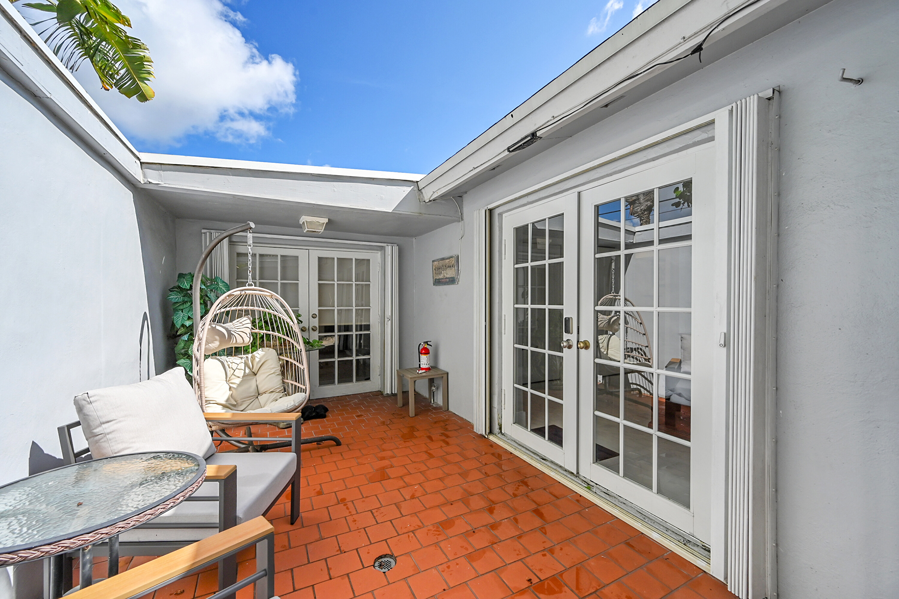 Nestled in a peaceful courtyard, the (B3) Courtyard Suite - Queen offers a queen bed with deep blue accents, ample natural light, a flat-screen TV, mini-fridge, and coffee maker, the room balances comfort & style. Thoughtfully designed for comfort and relaxation, this intimate retreat is perfect for unwinding in quiet elegance. Wake to the rustling of palm trees, enjoy your morning coffee in serenity, and embrace the calm of your private oasis.