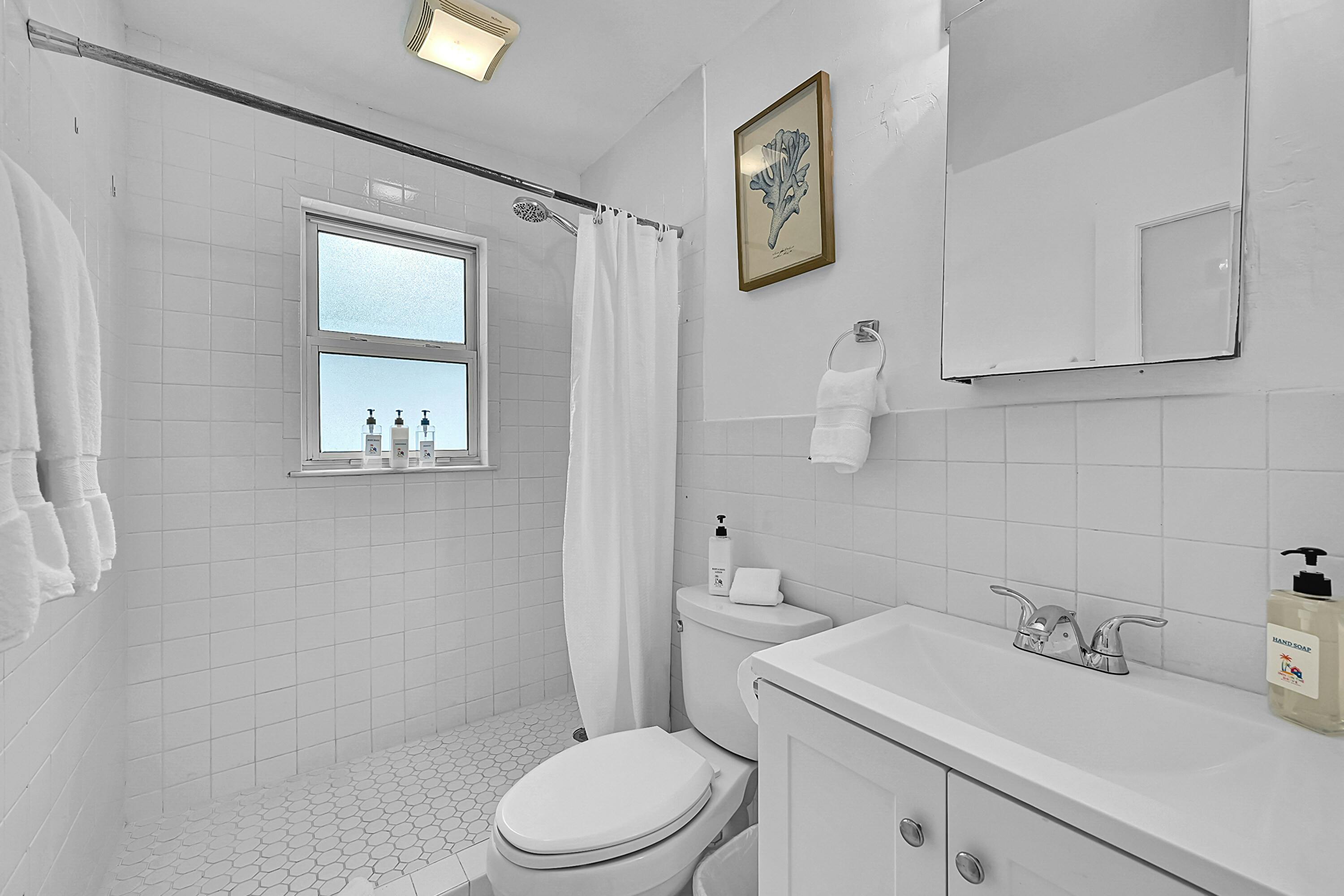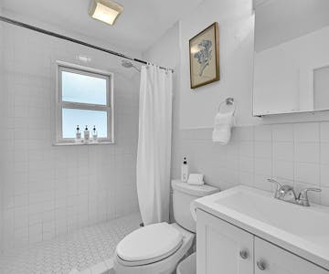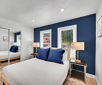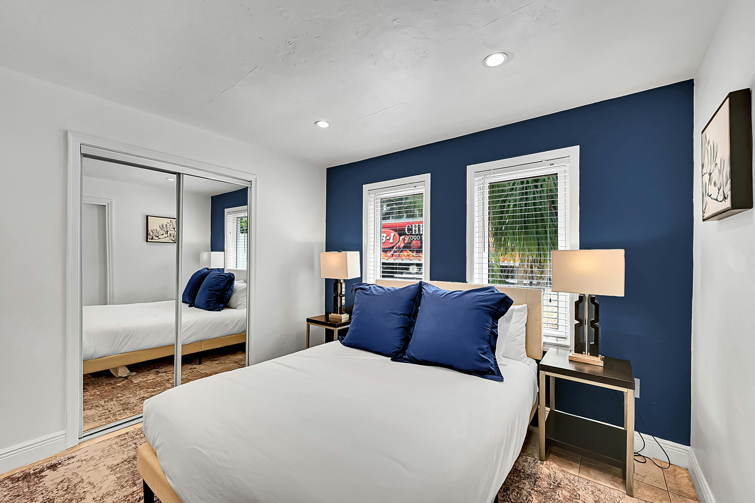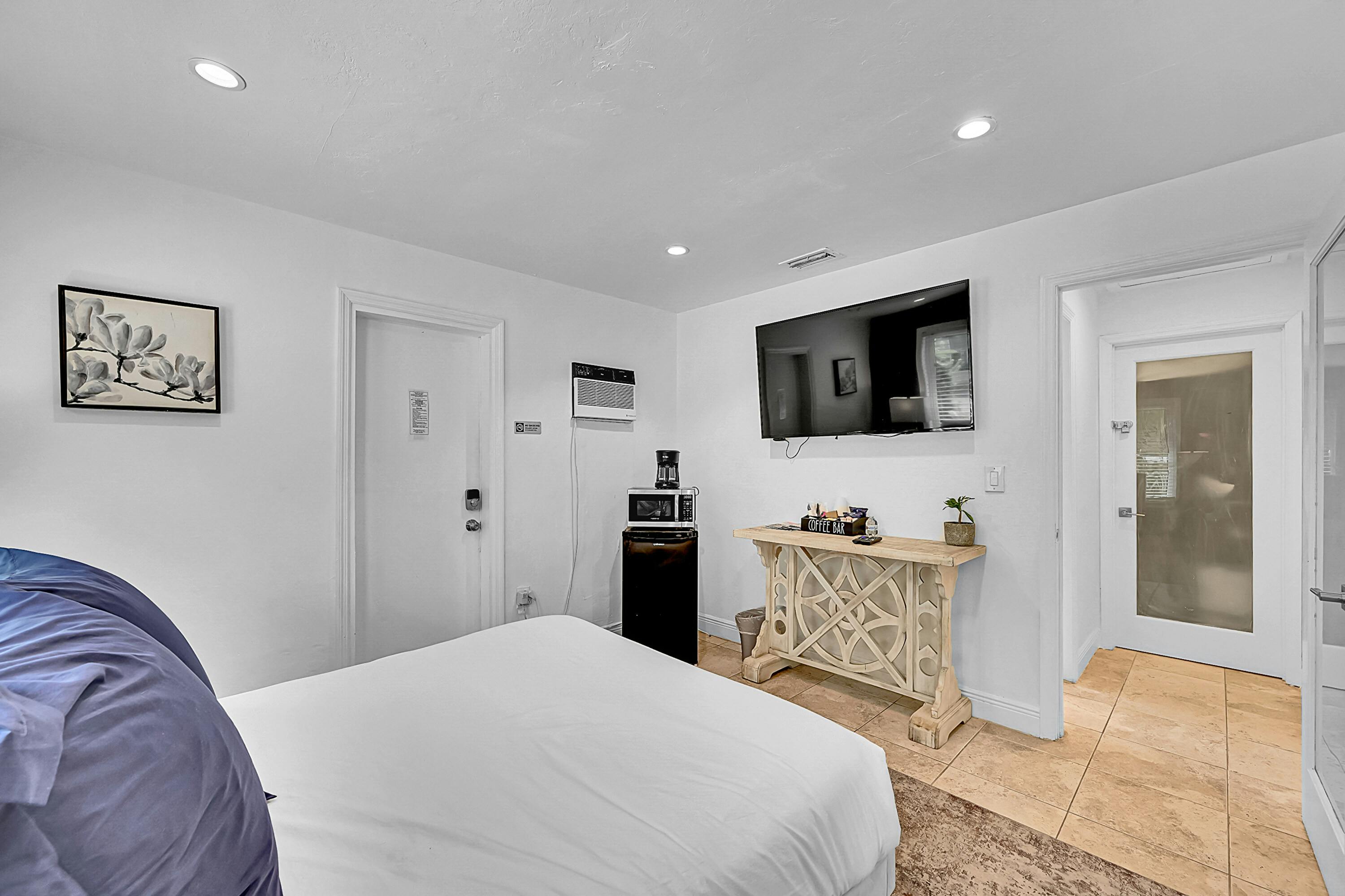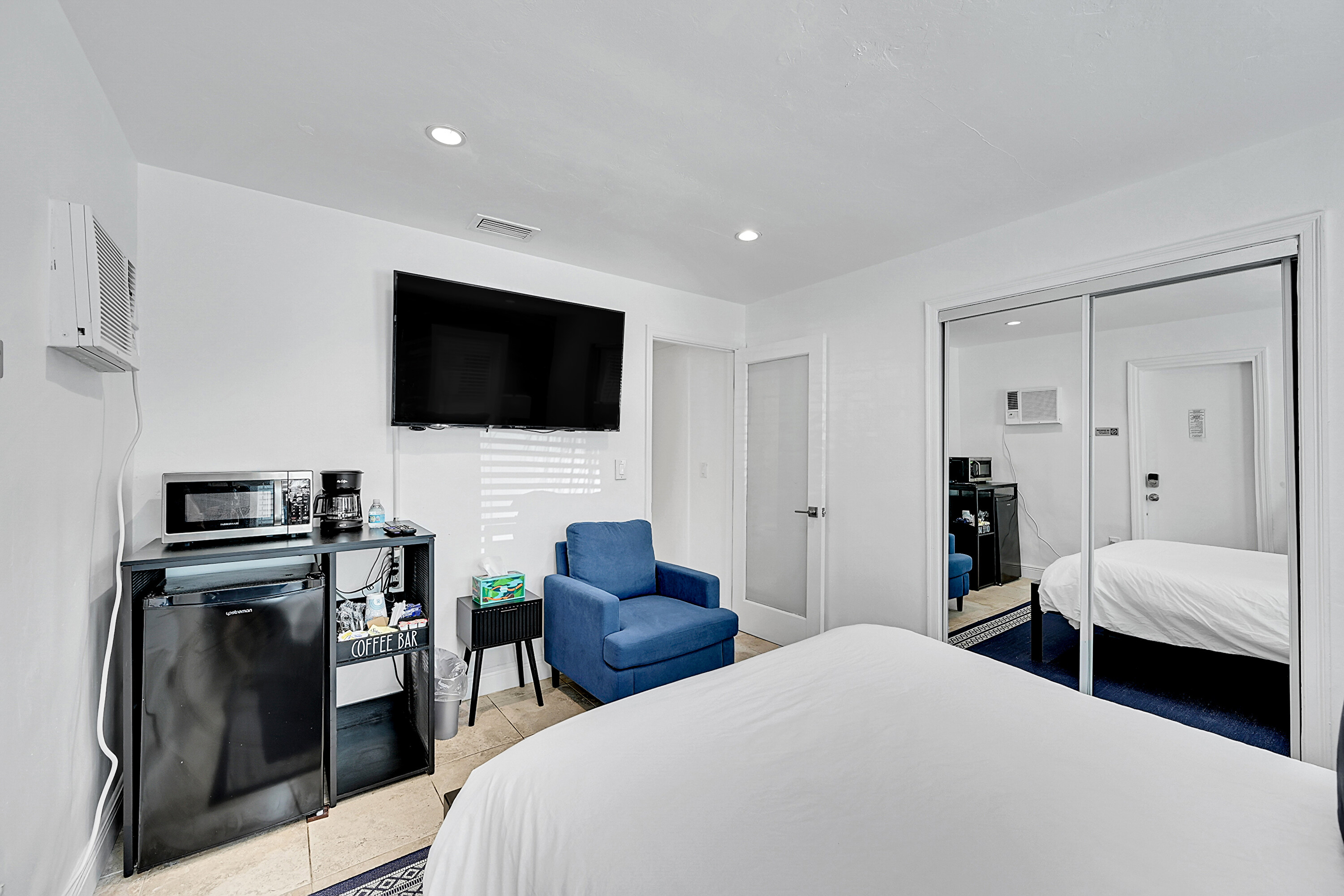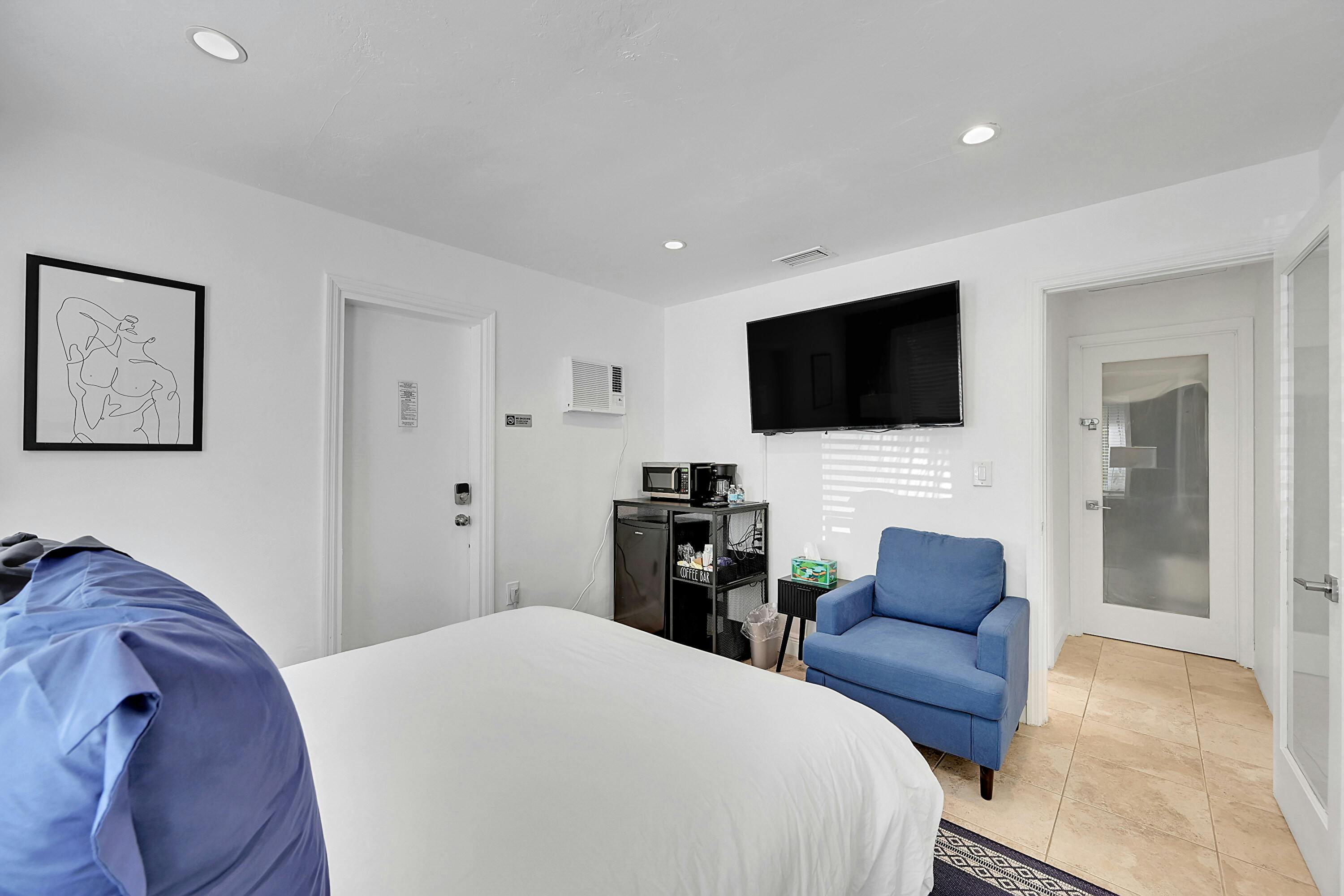 The (A0) Essential - Queen offers a serene one-bedroom escape perfect for solo travelers or couples. Featuring a queen bed with plush pillows, modern décor with deep blue accents, ample natural light, a flat-screen TV, mini-fridge, and coffee maker, the room balances comfort and style. The private bathroom includes a walk-in shower, modern vanity, and fresh, bright finishes.