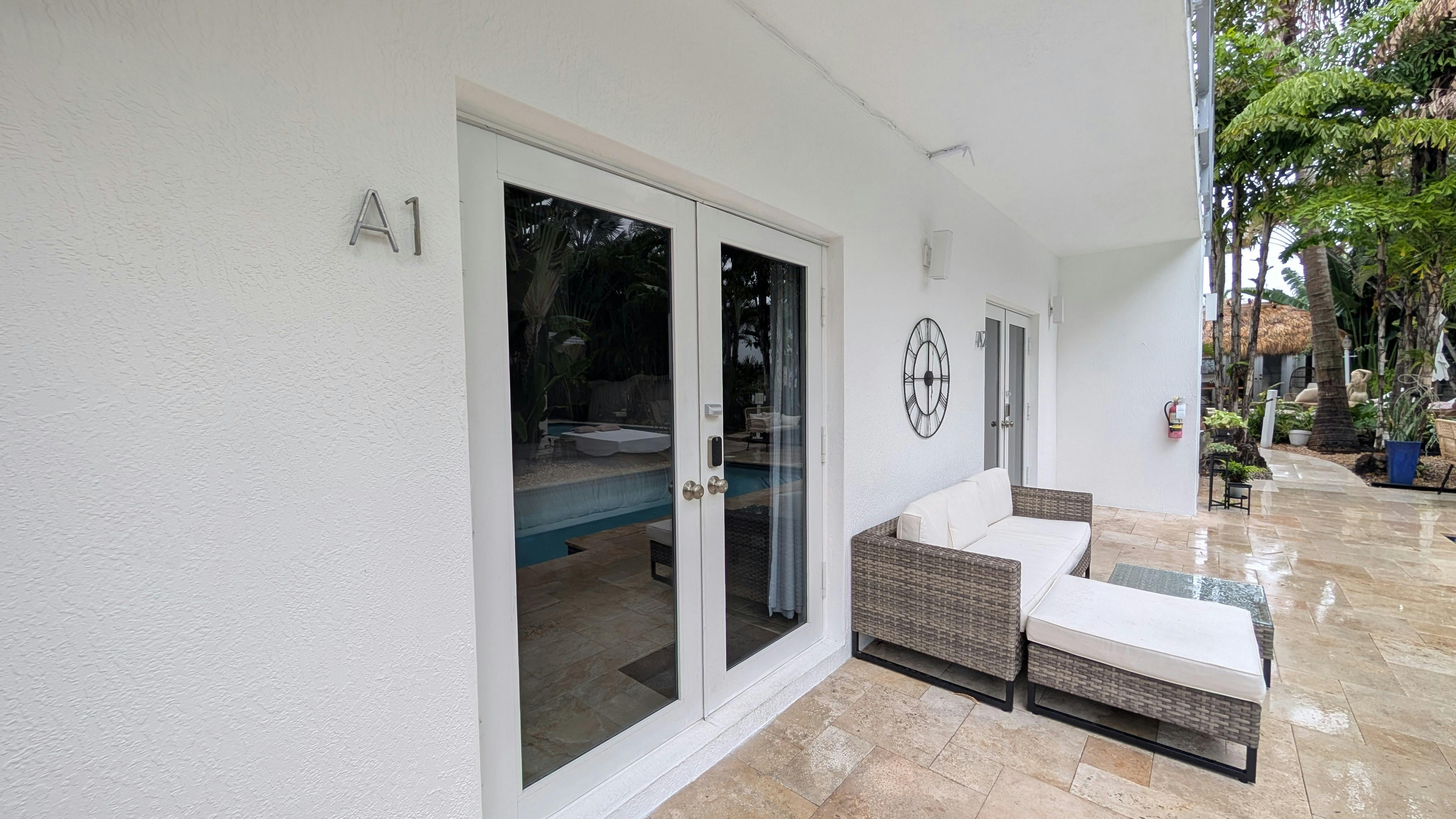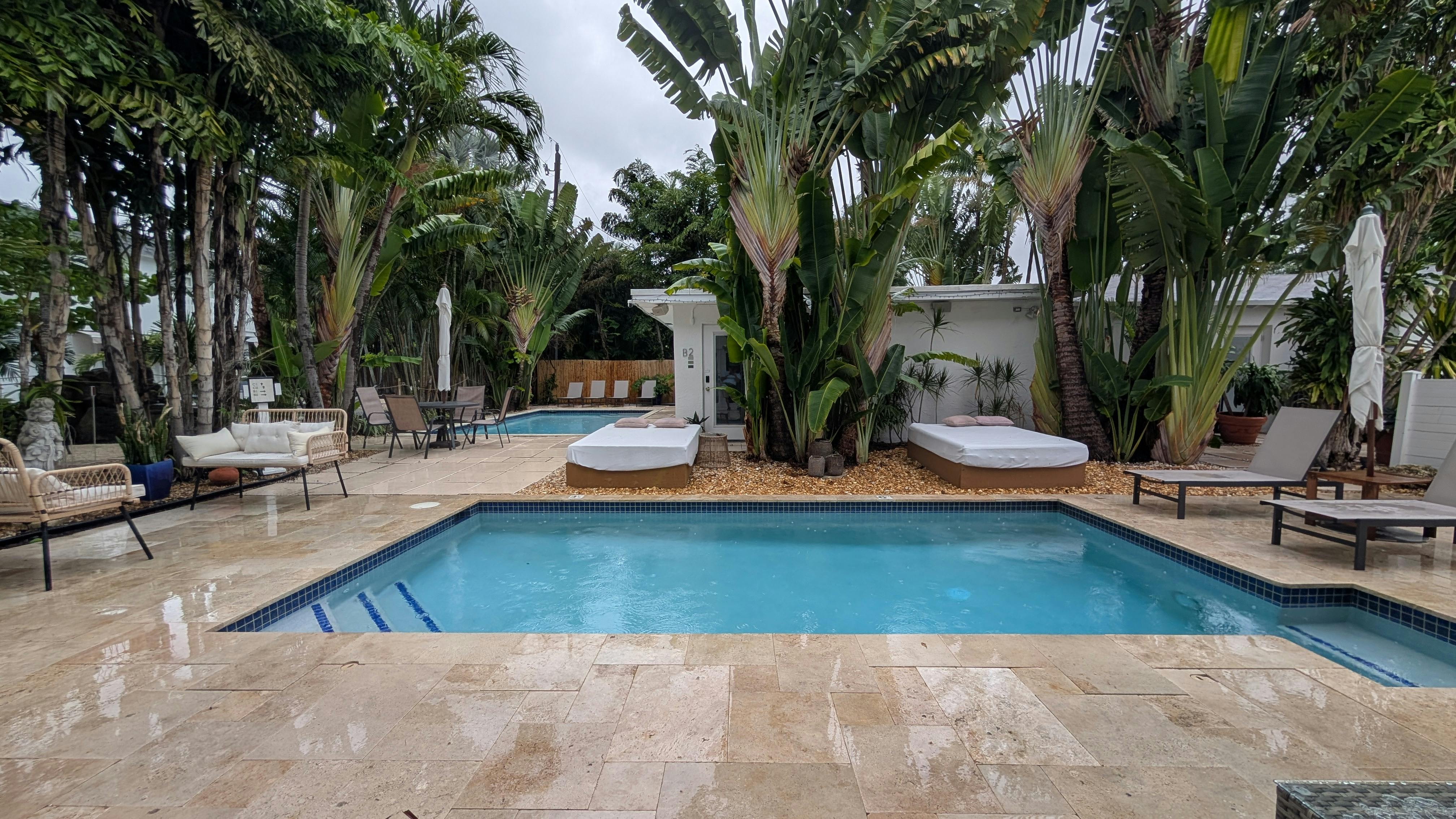 The Inn On The Drive is an Adult-Only, Clothing-Optional LGBTQ Resort surrounded by lush tropical landscaping, tall palms, and a patterned paver driveway. At the heart of the property, three sparkling pools, a soothing hot tub, and a private workout area are framed by a spacious tiled patio with lounge chairs, stylish daybeds, and outdoor dining tables - creating the ultimate tropical oasis for relaxation, leisure, and social enjoyment.