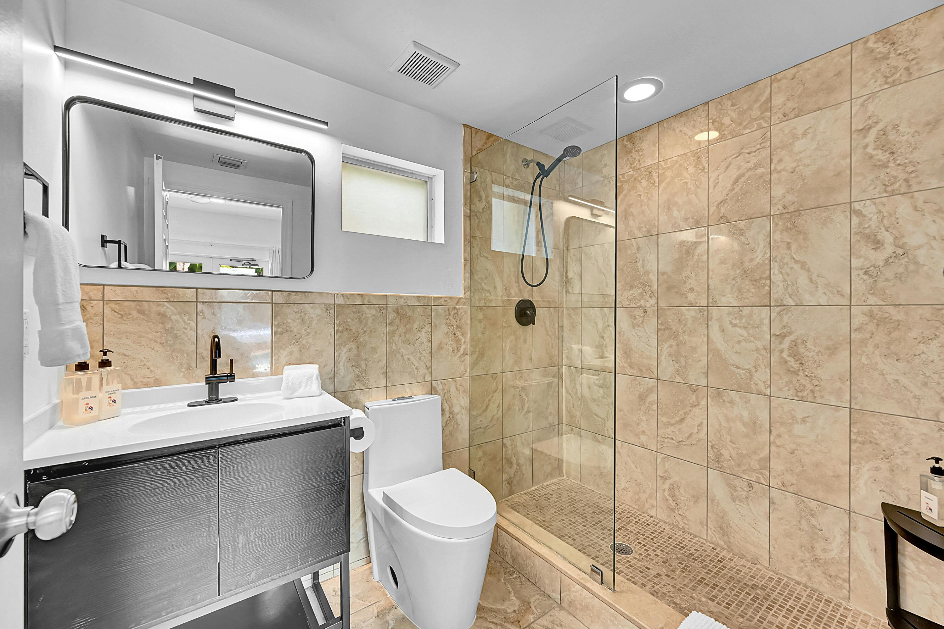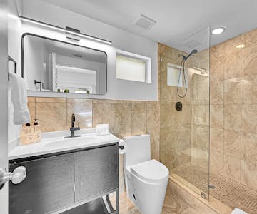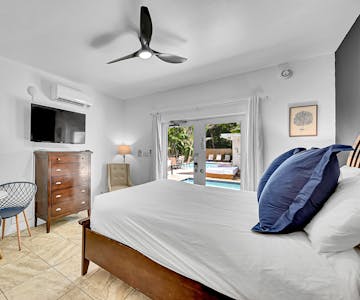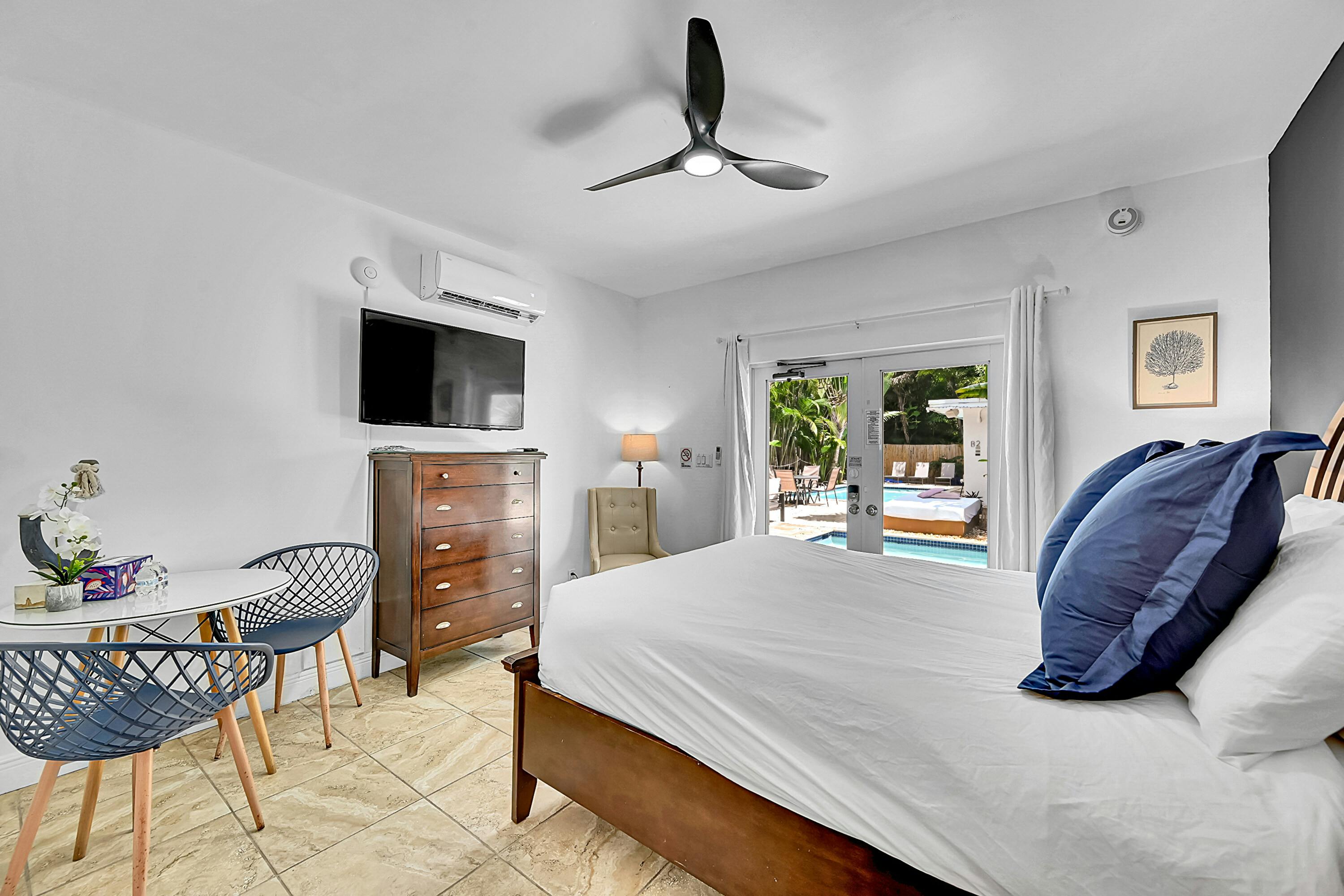 The (A2) Poolside - Queen is overlooking the pool offers a serene first-floor escape with a queen bed and elegant French glass door entrance with modern décor with deep blue accents, ample natural light, a flat-screen TV, mini-fridge, and coffee maker, the room balances comfort & style. Enjoy morning coffee with tranquil views, take a refreshing swim just steps from your door, or relax in the tropical ambiance of this stylish suite.