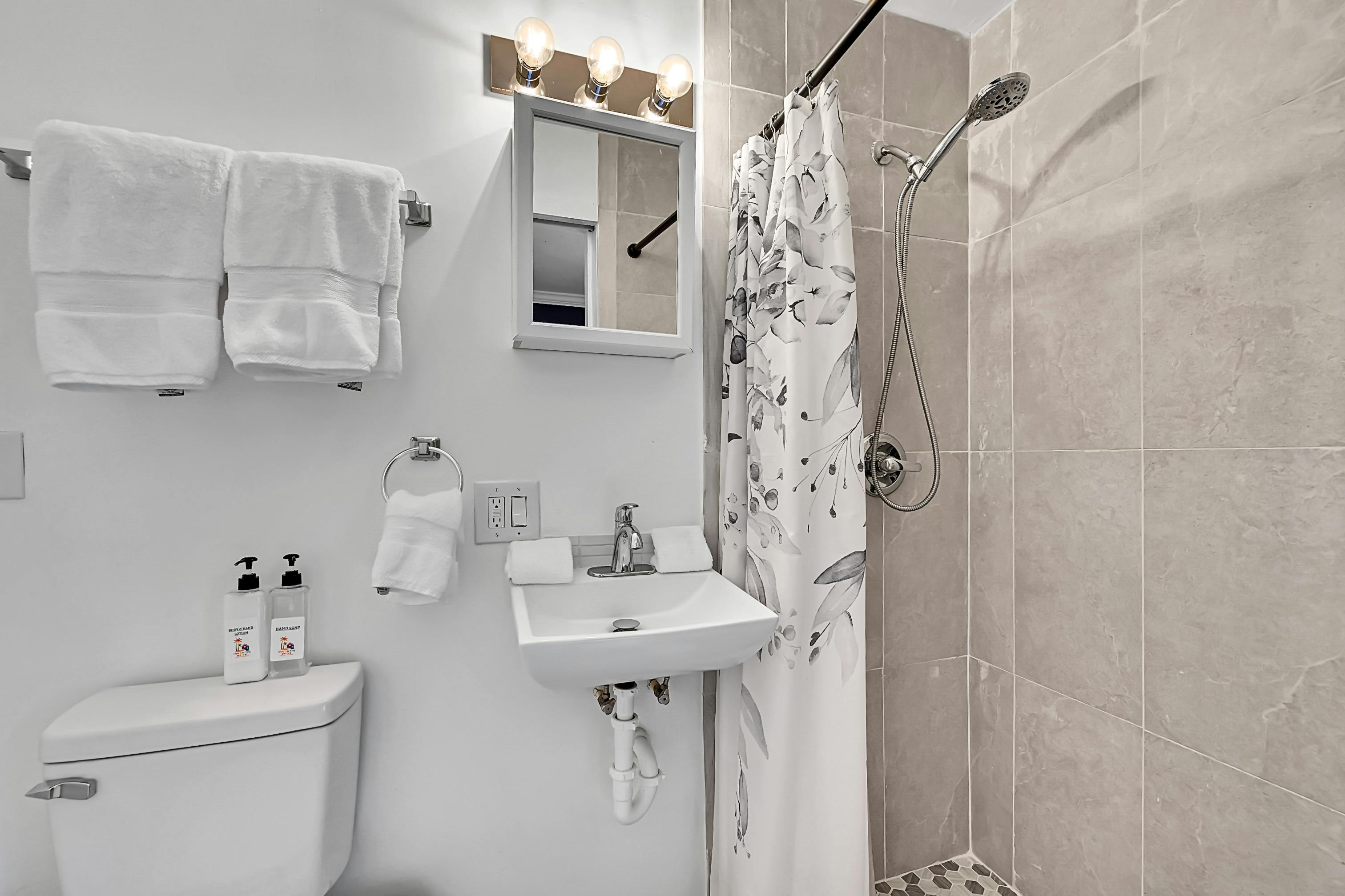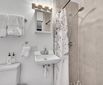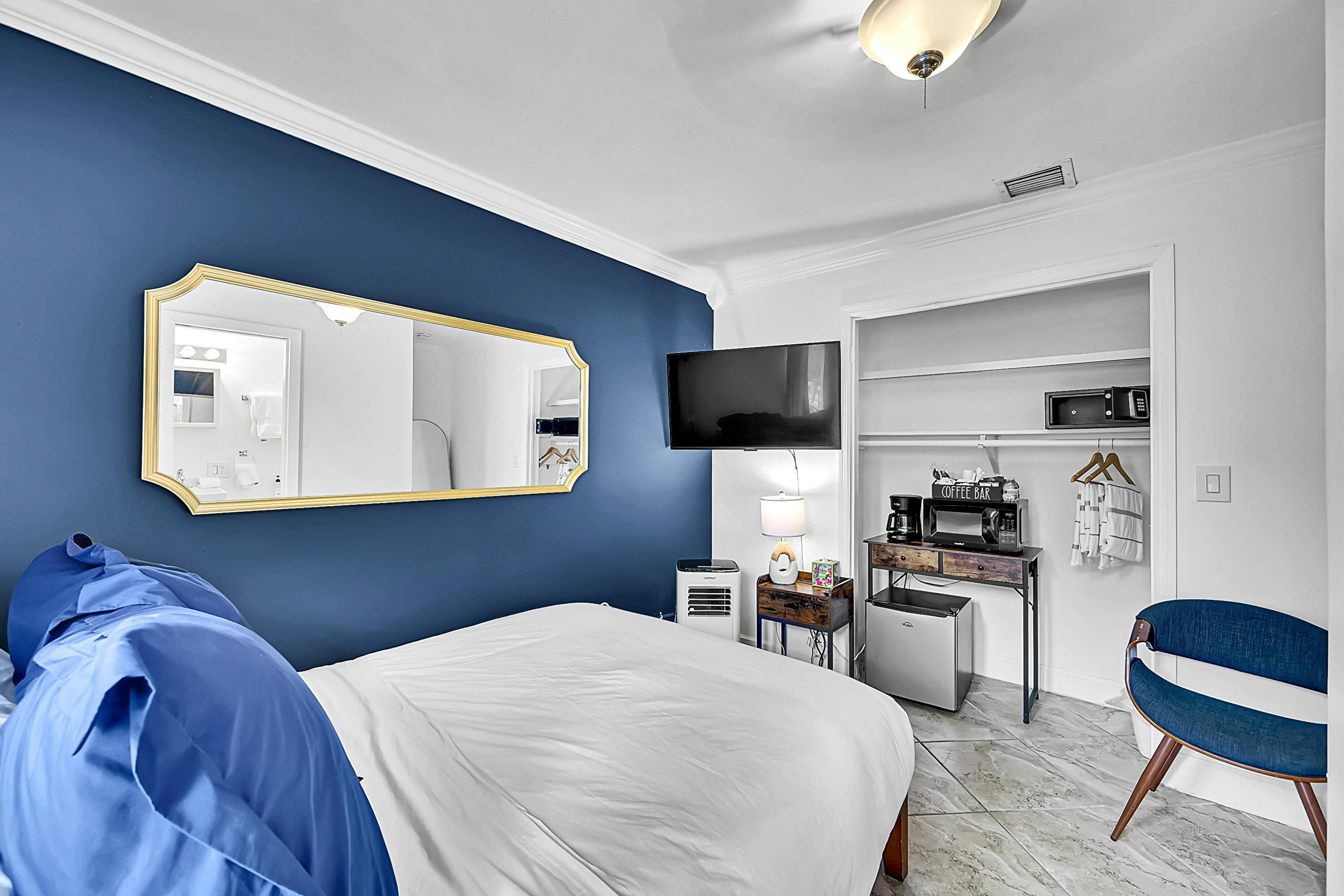 The (B0) Intimate - Queen offers a warm retreat with a queen bed - perfect for solo travelers or couples. Thoughtfully designed, it features a deep blue accent wall, an ornate gold-framed mirror, flat-screen TV, mini-fridge, coffee maker, and open closet storage. A sleek private bathroom includes a floating sink, walk-in shower, and modern finishes.