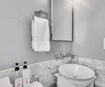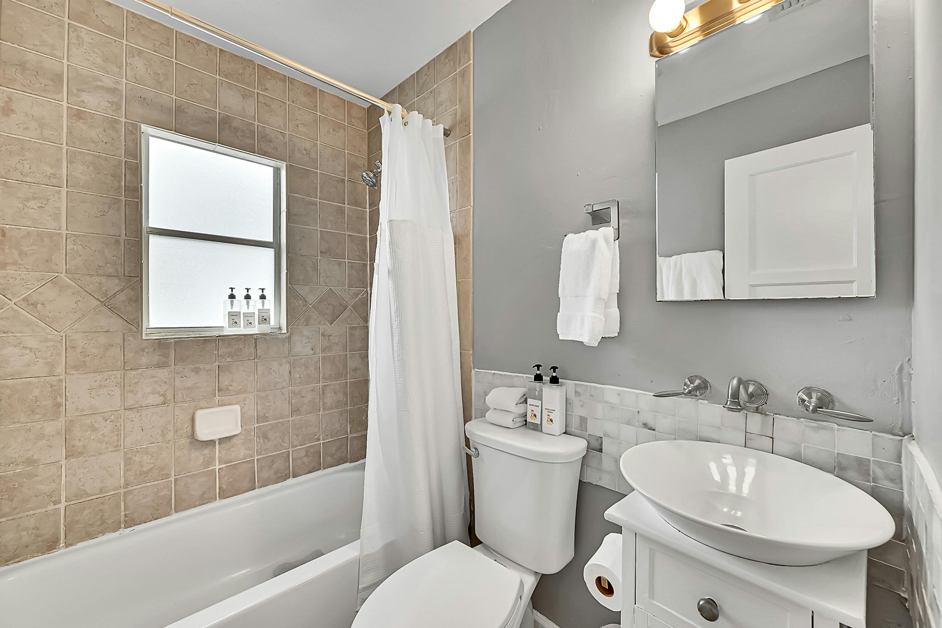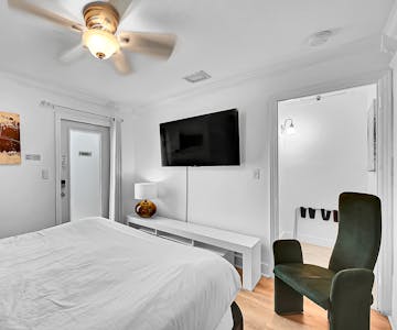 Perfectly positioned for both style and convenience, The (B00) Essential - Queen blends modern comfort with easy access to all resort amenities. The room features a queen bed with crisp linens, vibrant artwork, a flat-screen TV, mini-fridge, microwave, coffee maker, and a cozy armchair. The private bathroom offers a vessel sink, marble-tiled backsplash, and a shower/tub combination with natural light.