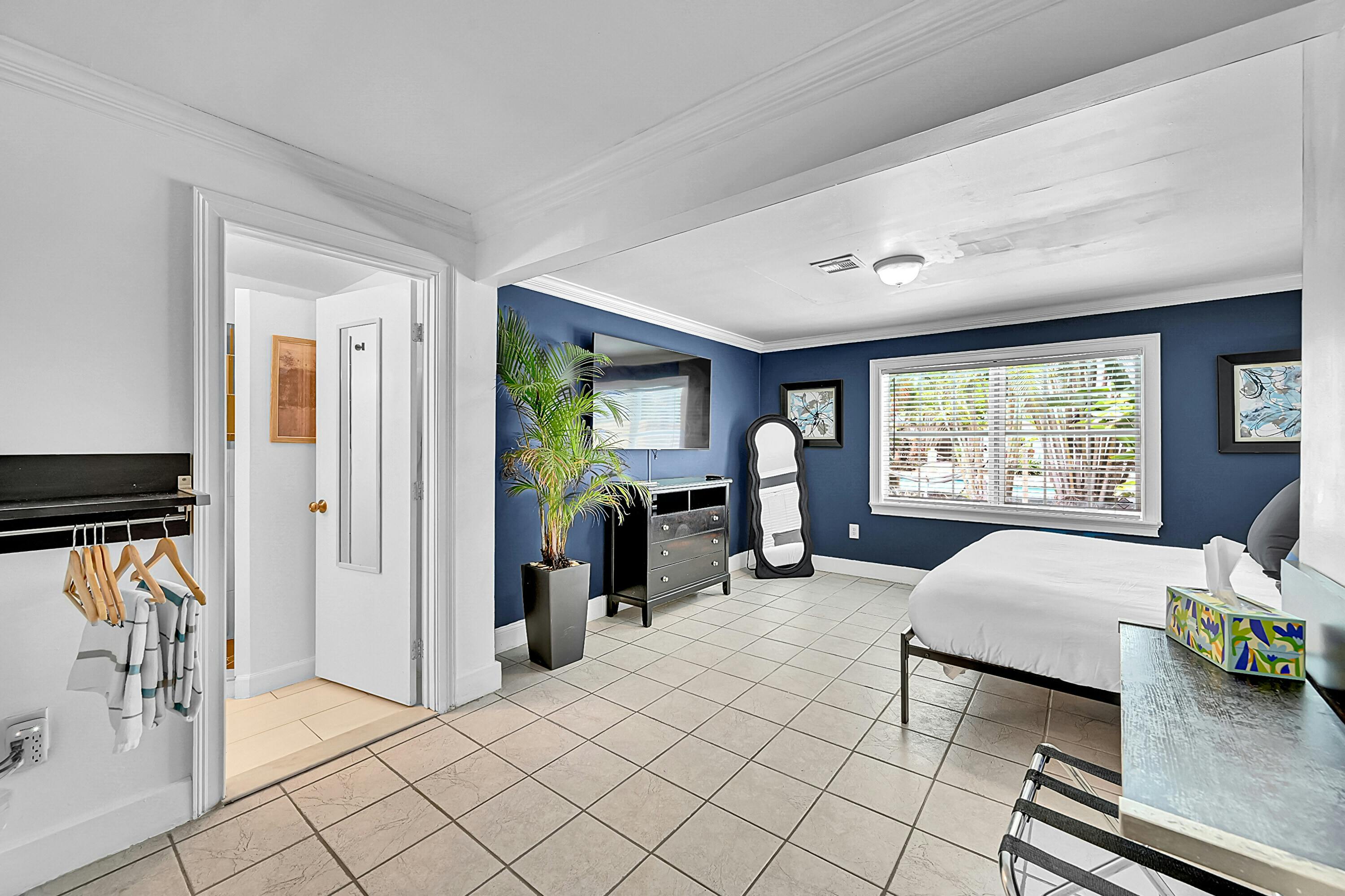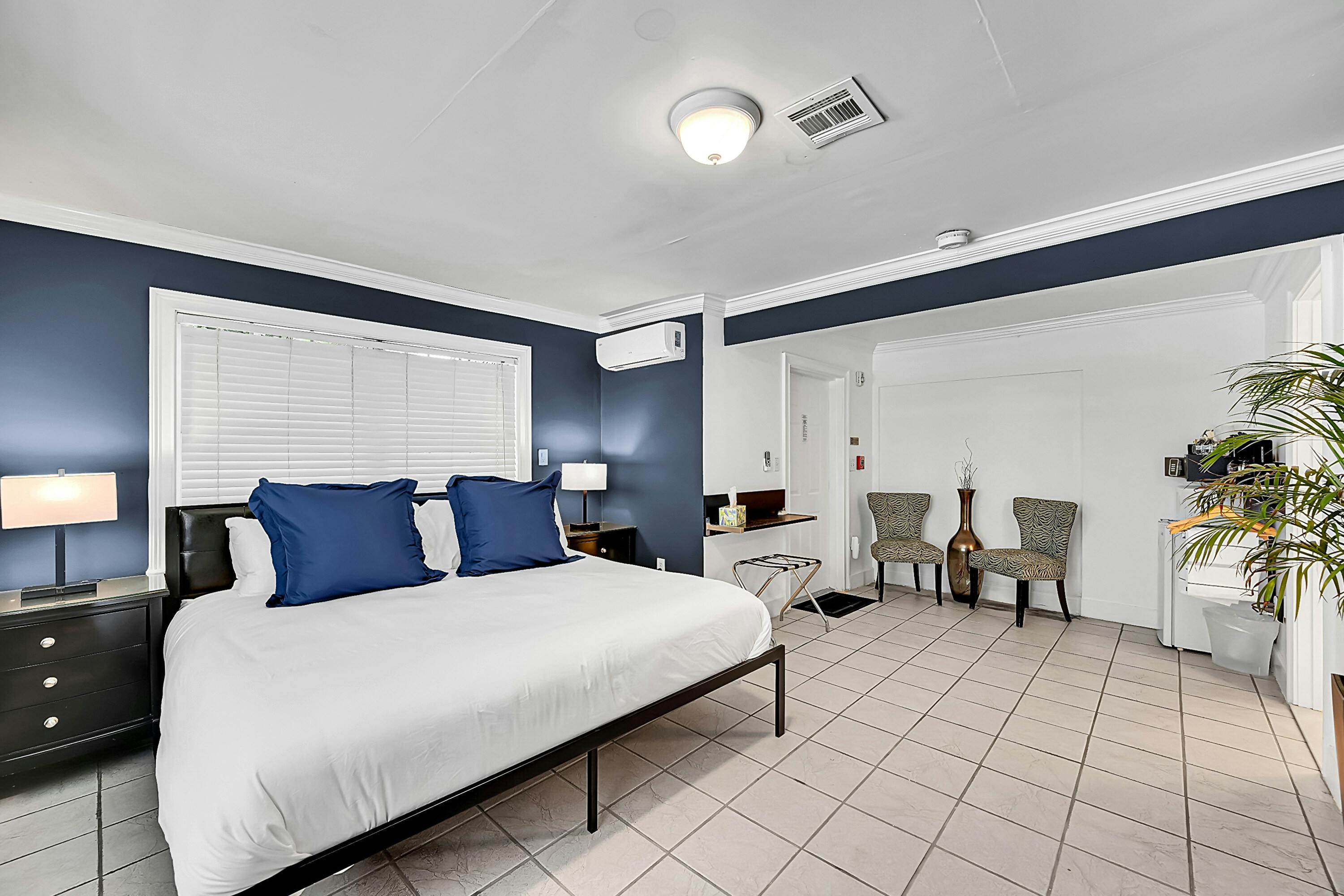 Experience elevated comfort in the (B1) Poolside Suite - King featuring a stunning pool views, a king bed with crisp linens, vibrant artwork, a flat-screen TV, mini-fridge, microwave, coffee maker, and a cozy armchair. Relax on your private seating area, take a refreshing swim, or enjoy the serene ambiance of this spacious suite designed for sophistication and tranquility.