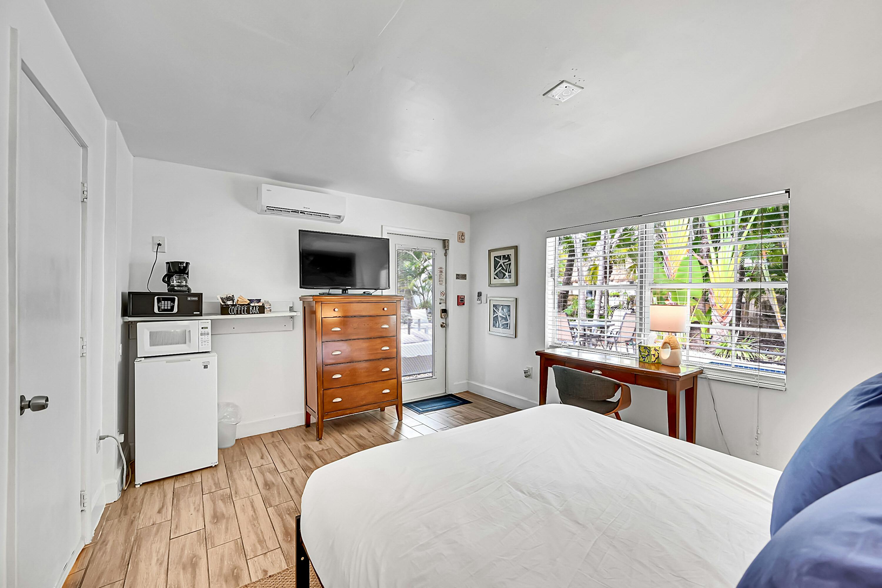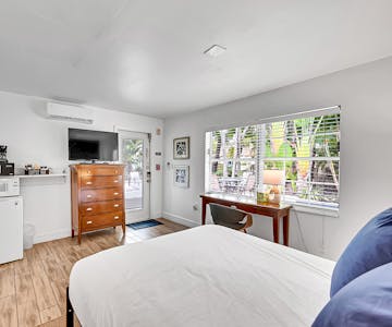Tucked in a quiet corner overlooking the pool, the (B2) Poolside Standard - Queen offers a refined retreat with a plush queen bed and elegant ambiance with deep blue accents, ample natural light, a flat-screen TV, mini-fridge, and coffee maker, the room balances comfort & style. Spacious yet intimate, it’s designed for both comfort and style - perfect for a peaceful getaway or a romantic escape.