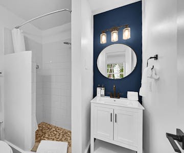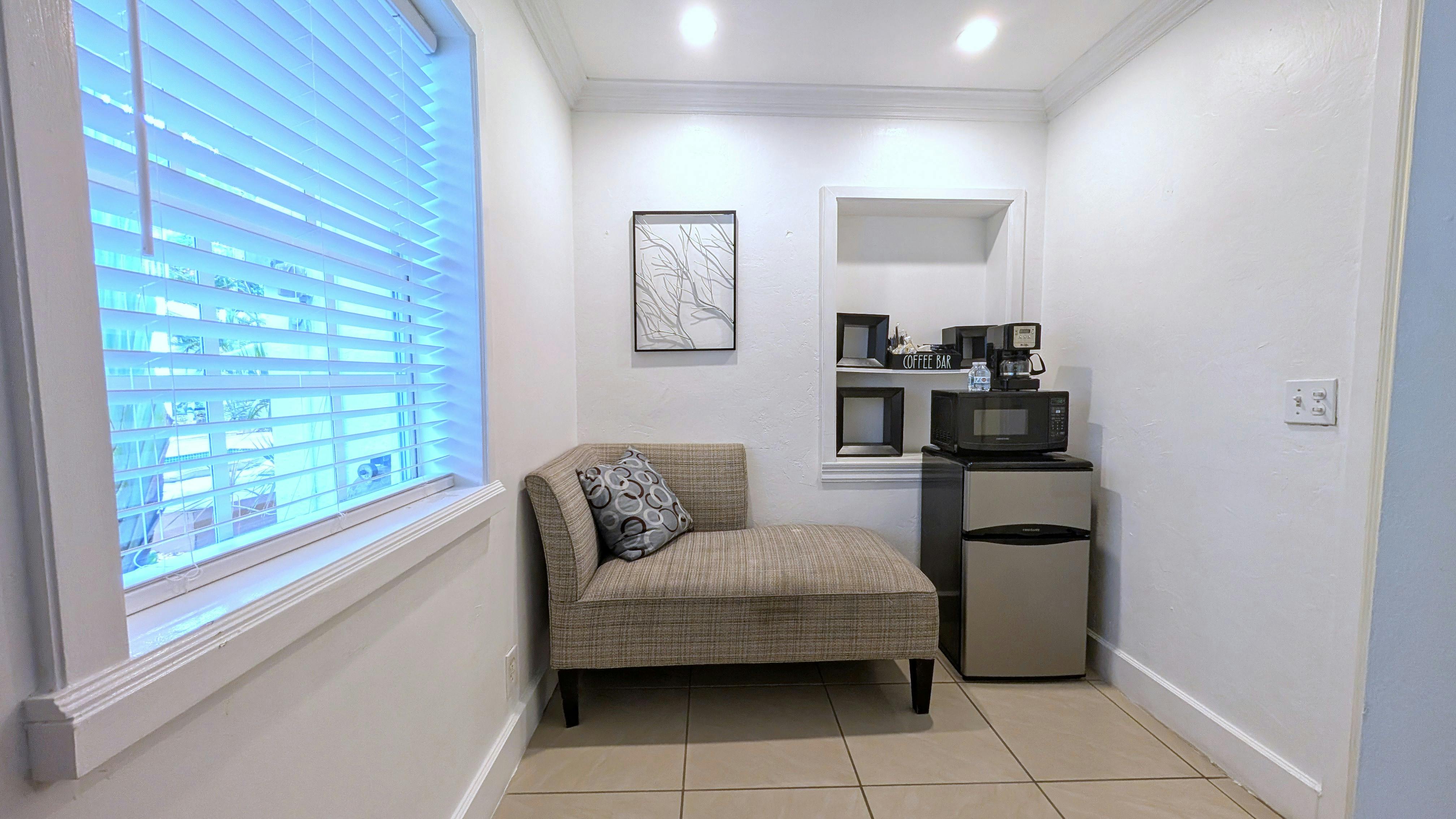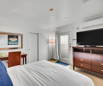 Nestled in a peaceful courtyard, the (B3) Courtyard Suite - Queen offers a queen bed with deep blue accents, ample natural light, a flat-screen TV, mini-fridge, and coffee maker, the room balances comfort & style. Thoughtfully designed for comfort and relaxation, this intimate retreat is perfect for unwinding in quiet elegance. Wake to the rustling of palm trees, enjoy your morning coffee in serenity, and embrace the calm of your private oasis.